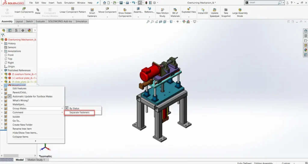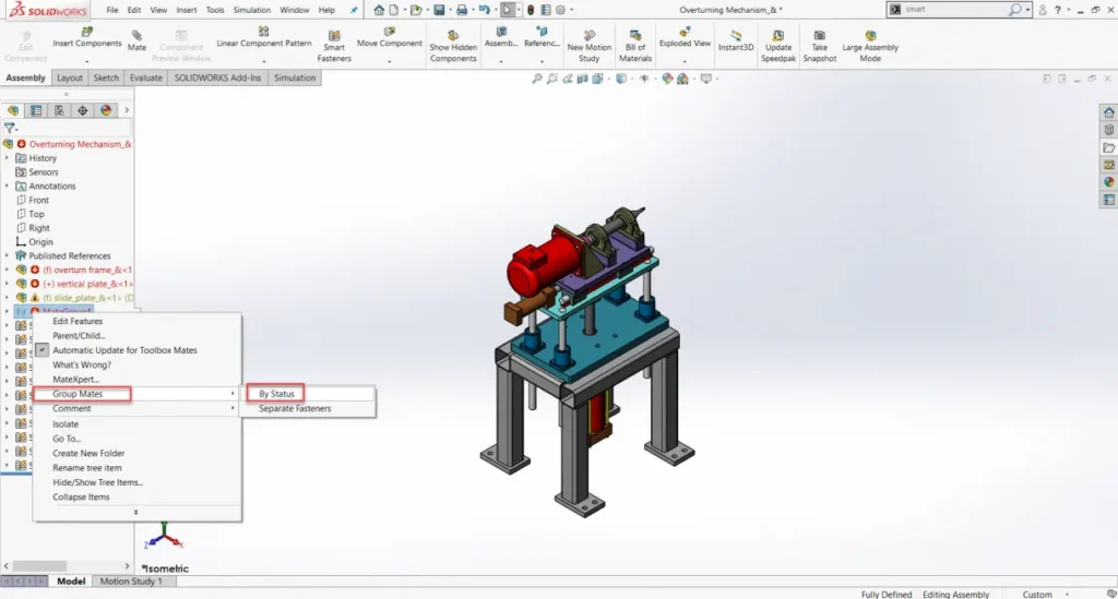 In SOLIDWORKS , you can group SOLIDWORKS Assembly mates by status and separate fasteners into folders. You can group the mates by their status, such as Solved mates, mates with Errors, Over defined mates, Suppressed mates, Suppressed mates that reference missing components, and Inactive (fixed) components (mates that reference fixed components).