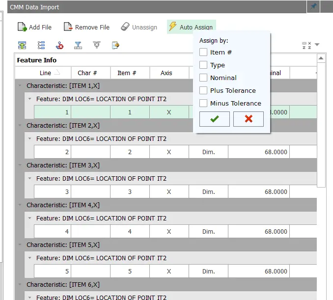 Once the file is added, use the ‘Auto Assign’ button to have Inspection attempt to map all the measurements in the CMM file to the Inspection project. You can choose one or more categories for Inspection to use, including Item #, Type, Nominal, Plus Tolerance, and Minus Tolerance.